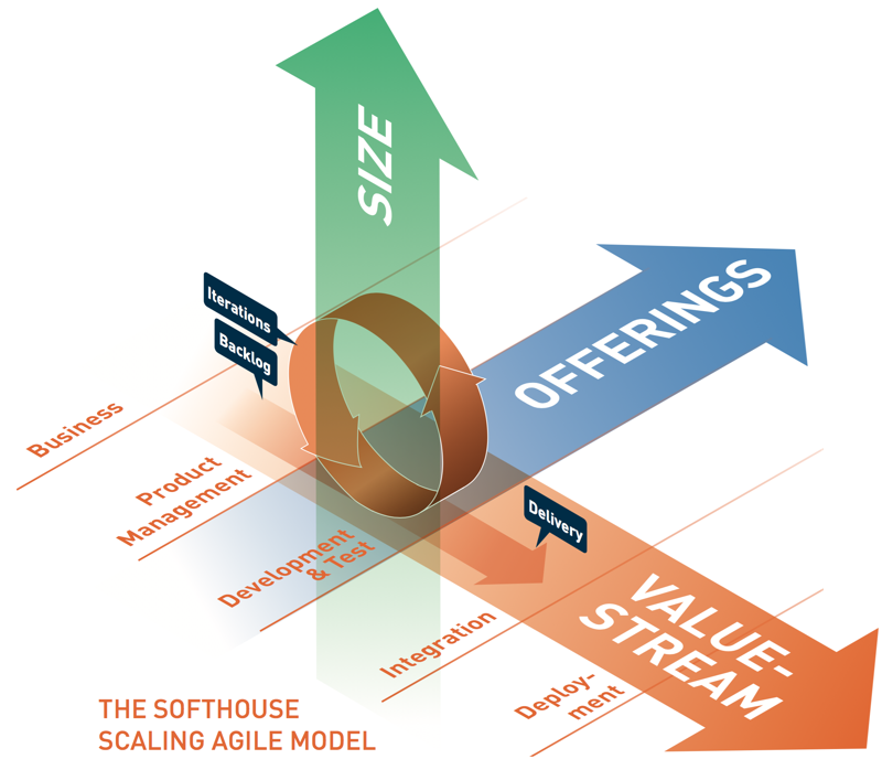 To deal with these challenges, a multitude of methodologies for scaling Agile has been suggested: SAFe, DAD, LESS, Scaled Professional Scrum and several others (see page 14). To handle and understand these methodologies, we have introduce the Softhouse Scaling Agile Model. It is based upon three dimensions: